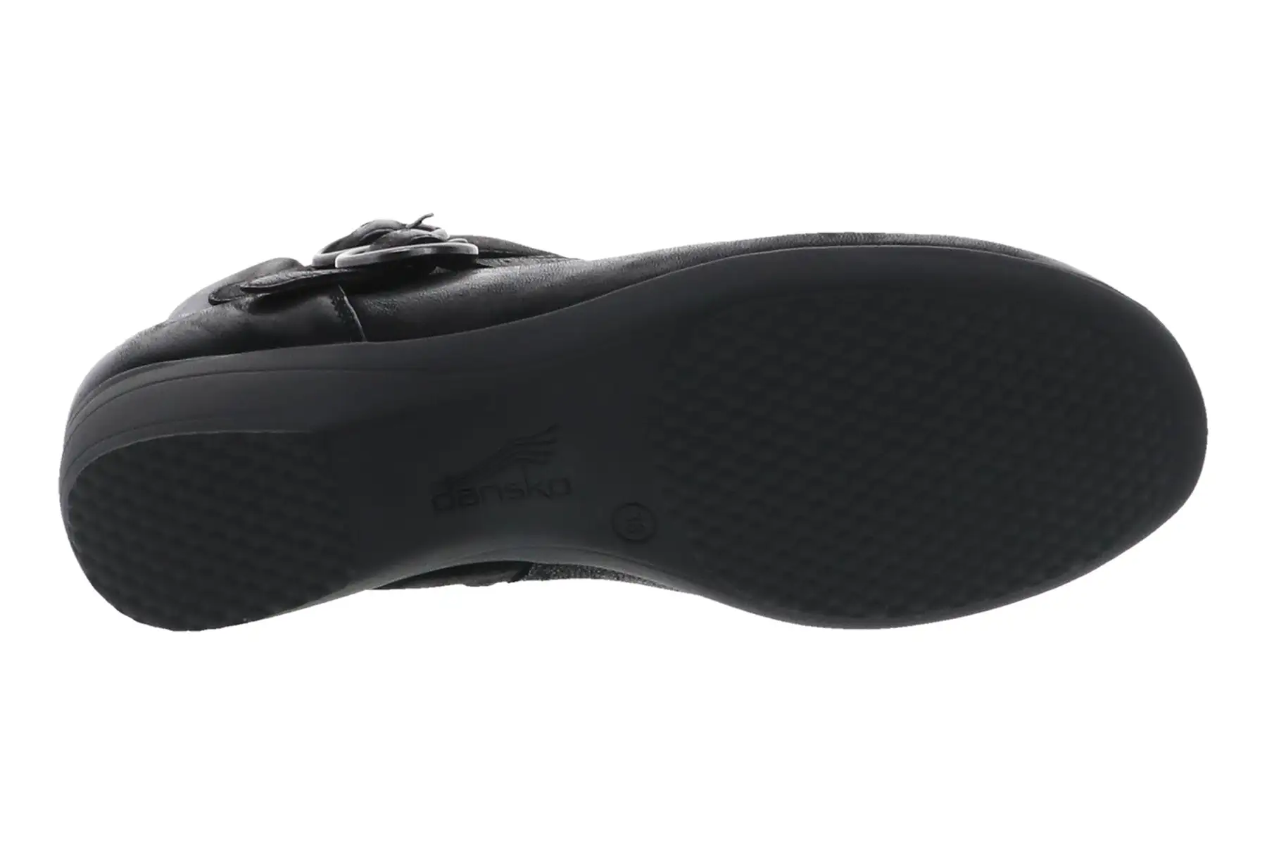 Faithe is a slip-on ankle bootie with an inside zip and double adjustable buckles, soft leather and textile linings for all-day comfort, a removable, molded EVA footbed with Dansko Natural Arch technology for support and cushioning, and a rubber outsole for long-lasting wear.